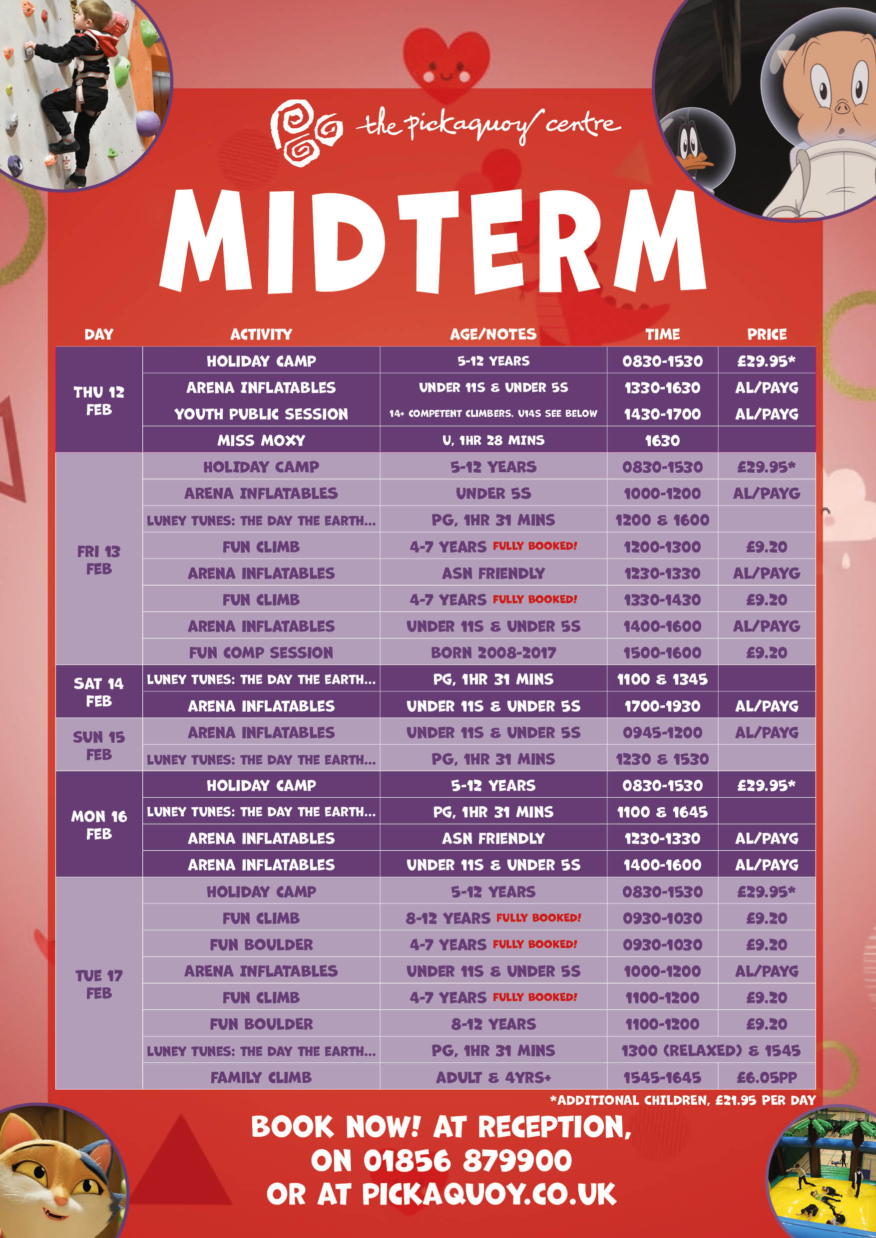 A popular holiday session! 1 hour of climbing or bouldering, try our different routes and see how high you can get! Sessions for age 4-7 and 8-12 Book at Reception, on 01856 879900 or online